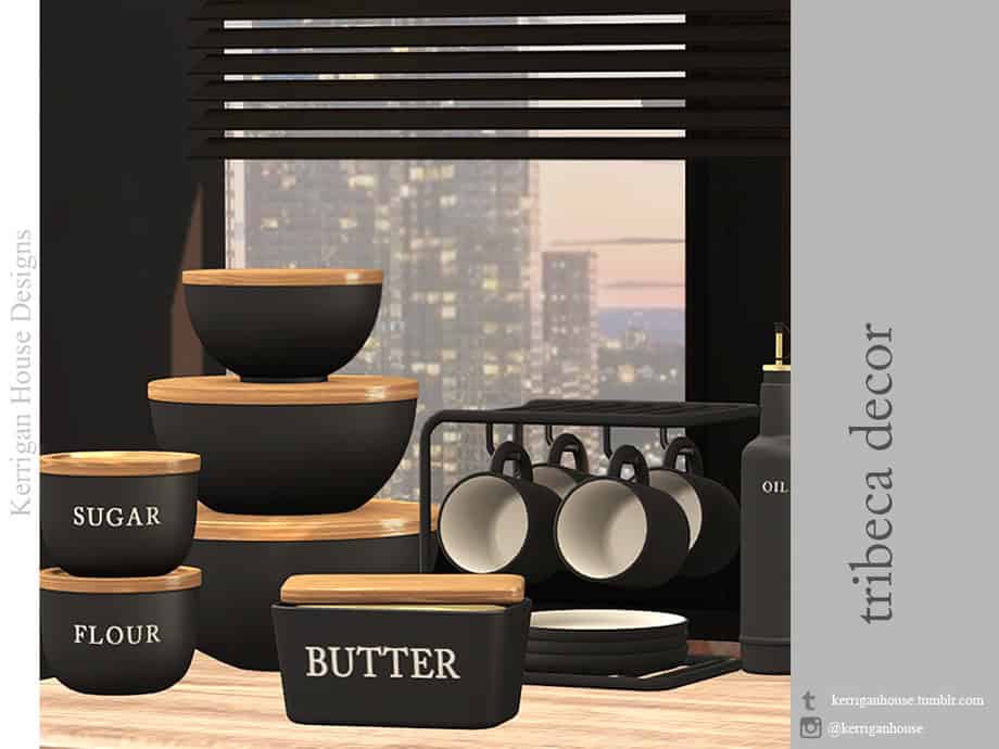 I’ll start with the Tribeca Decor set, which is a modern and minimalist kitchen collection that instantly adds a chic New York loft feel to your Sim’s home. This pack includes seven creations: oil and vinegar bottles, a set of bowls, a butter tub, a cup rack, a decorative recipe book, sleek soap dispensers, and stackable storage tubs for sugar and flour.