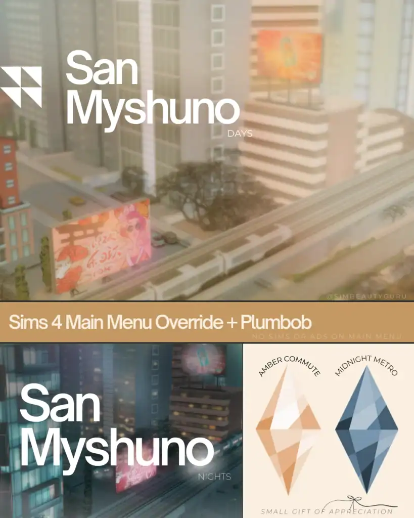 Bring the city life straight to your Sims 4 startup screen with this San Myshuno-inspired override pack. It features multiple backgrounds divided into two categories: