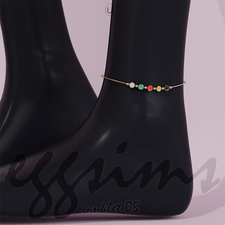 Anklet 05 is a slim chain anklet finished with small, colorful beads. You’ll find the anklet in 12 swatches, giving you different color combinations to match your Sim’s outfit.