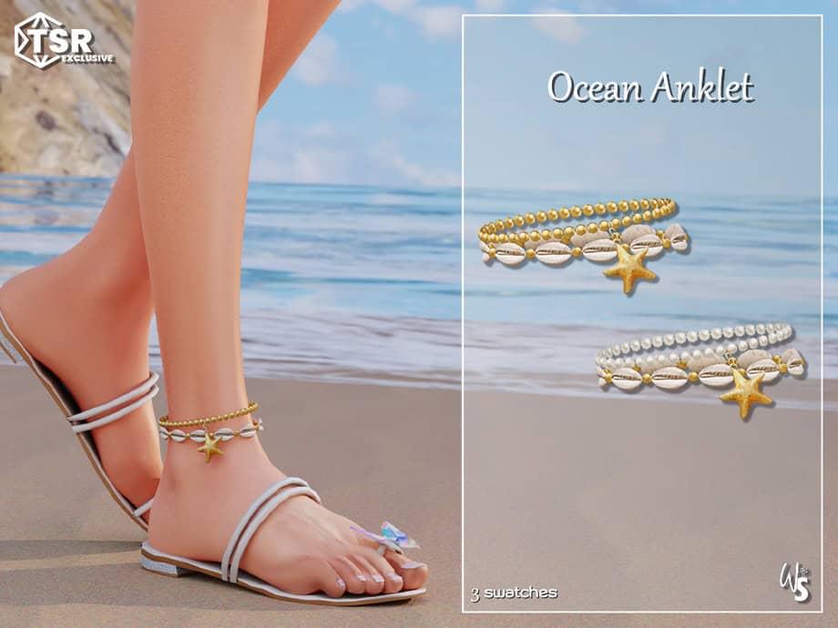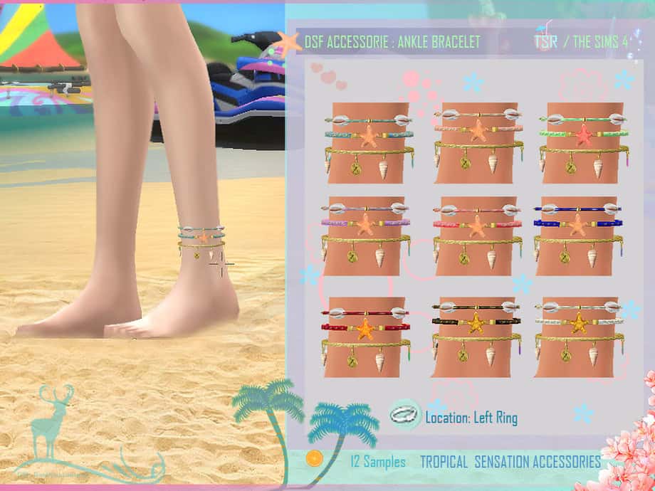 If you want a colorful, layered anklet, the DSF Accessory Ankle Bracelet is a great choice. This beautiful piece is composed of three stacked bands, each with small starfish and shell charms for a detailed finish. You’ll find the Sims 4 anklet cc in 12 swatches with different color combinations, making it easy to match bright summer outfits.