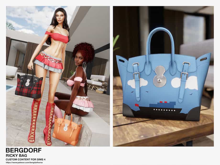 If you want an accessory to finish off your luxury outfit, this Sims 4 bags cc will surely come in handy. It comes in two different swatches: black and creamy and blue and white. Pair it with the right Jeans CC Female for a baddie look.
