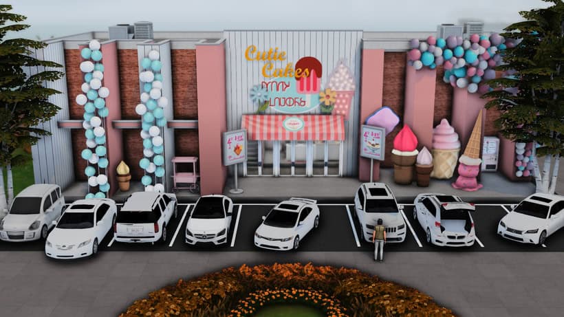 The seating areas are styled with soft pink lounge pieces and photo-ready backdrops, giving your Sims a place to relax between sales. The lot uses bb.moveobjects, and you can repurpose it as a restaurant if you want it to serve only sweets and frozen desserts.