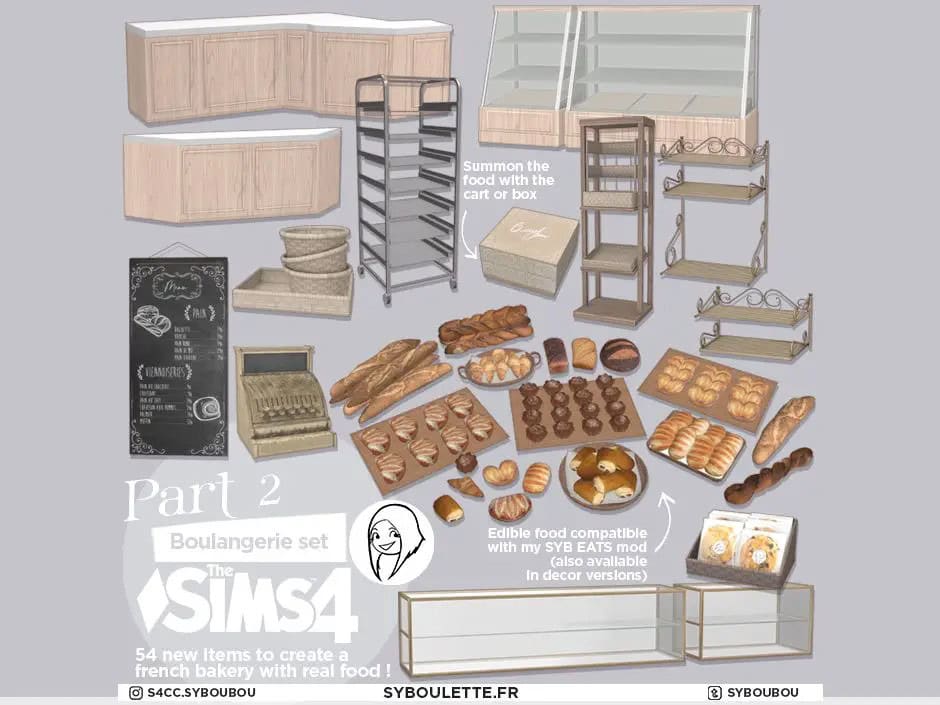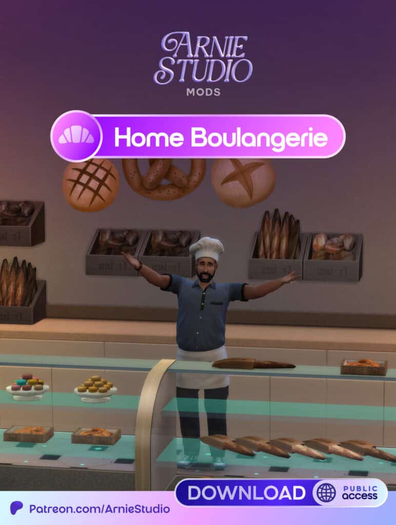 If you want to set up a fully functional bakery, check out this updated Home Boulangerie kit. It’s rebuilt from the ground up and expanded into a polished 2.0 release. The new cc introduces a bakery machine that works like the Cupcake Factory, allowing your Sim to craft French staples such as baguettes, croissants, macarons, and artisan loaves.
