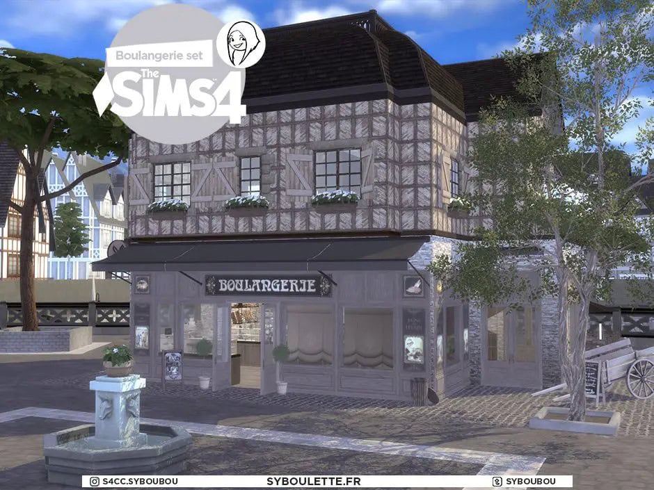 If you’re looking for a fully built, French-inspired bakery lot to add to your world, get this Boulangerie build. The exterior leans into rustic timber framing with flower-lined windows and a charming corner storefront that fits beautifully in Windenburg’s Old Quarter.
