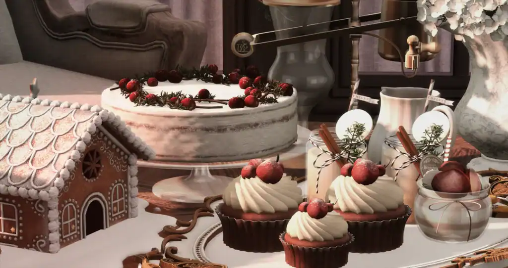 This set of festive desserts and décor pieces brings a holiday glow to your family dinner. The Sims 4 baking cc of beautifully styled treats features layered cakes, gingerbread houses, winter-themed cupcakes, spiced drinks, fruit-topped pastries, and decorative jars