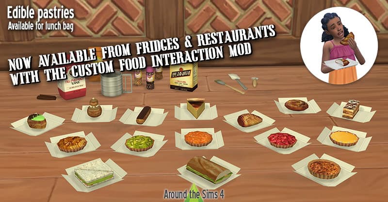 Every pastry is fully edible, as long as you have the Custom Food Interactions mod. This means your Sim can buy them from the fridge, order them at a restaurant, or pick them up straight from the Buy catalog.