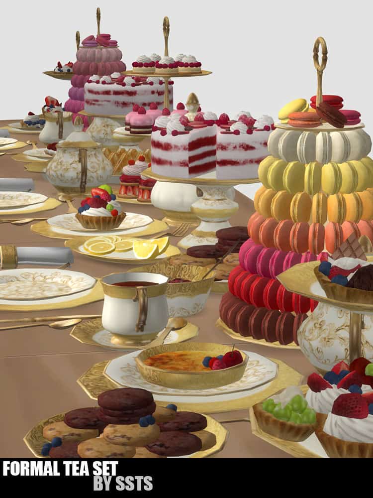 This Formal Tea Set contains 19 base-game compatible pieces you can use to transform any bakery, dining room, or afternoon-tea screenshot into a luxury spread.