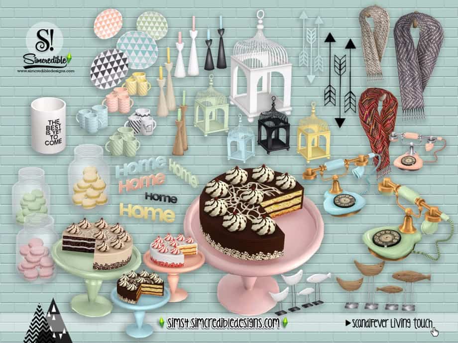 The Scandifever Living Touch brings a soft Nordic charm into your Sim’s interiors. It contains tiered cakes, macaron jars, patterned plates, and ceramic mugs. It also has sculpted candle stands and minimalist wall arrows that instantly warm up any bakery, café, or cozy living space.