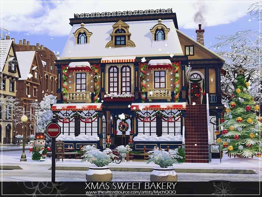 Completing this Sims 4 baking cc set is the Xmas Sweet Bakery. It’s a festive three-story shop lot wrapped in holiday charm and sparkling winter décor. The exterior leans into classic European architecture, with arched windows, detailed trim, and bold Christmas garlands.
