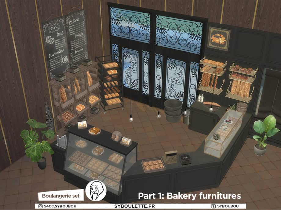 Use the Boulangerie furniture set to create a warm, lived-in bakery for your world. This Sims 4 bakery cc offers the kind of counters and displays you’d expect in a classic French bread shop. The collection includes corner counters, single- and double-tile displays, and iron wall shelving in multiple sizes for arranging loaves, pastries, and décor.