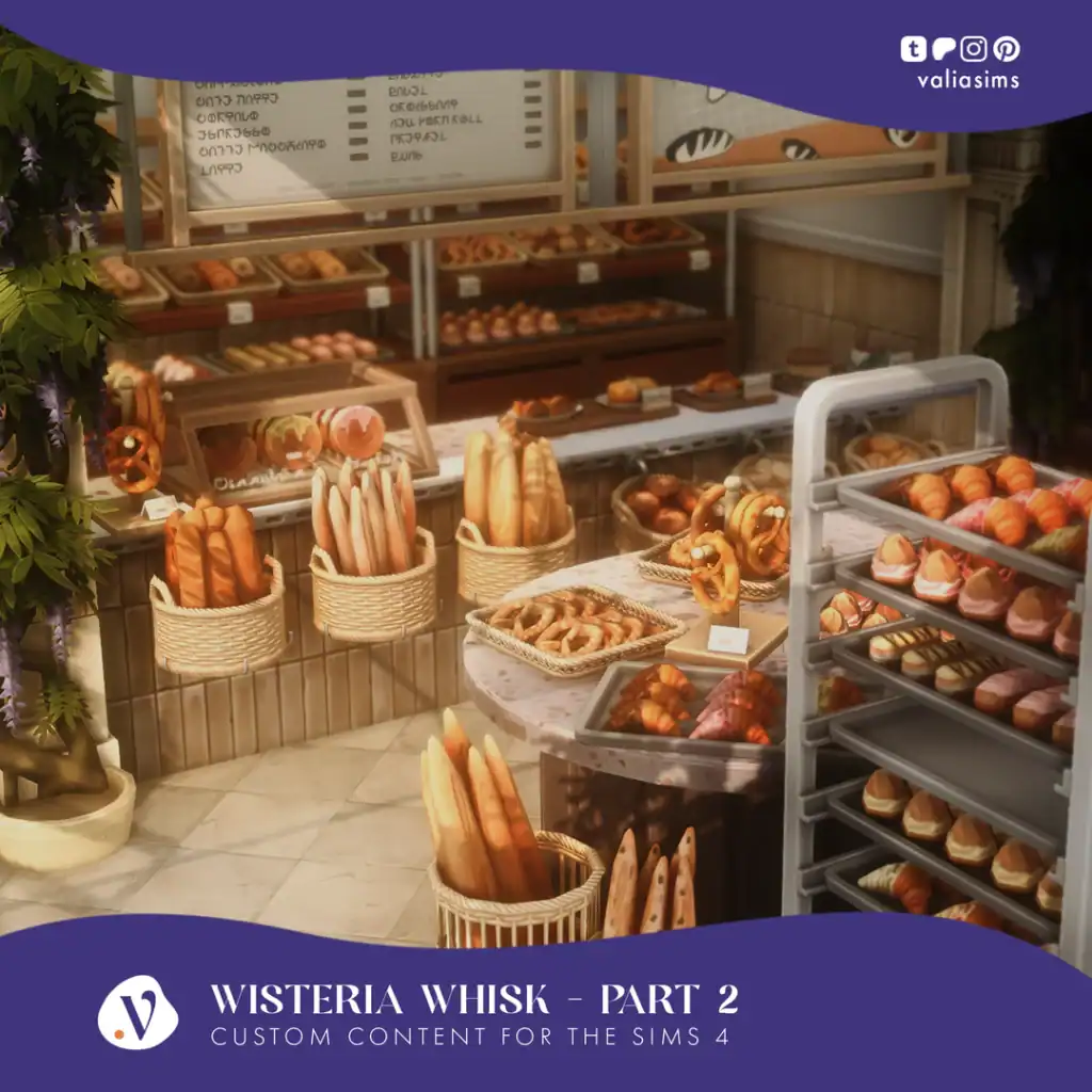 We’ve got something here for Simmers who want a richly stocked bakery display. This second Wisteria Whisk release expands the previous collection with new shelves, baskets, and pastry trays designed for warm interiors. The set includes multi-sized display shelves, baguette baskets, tray trolleys, wall baskets, and assorted baked-goods trays featuring croissants, pretzels, cream puffs, and breads.