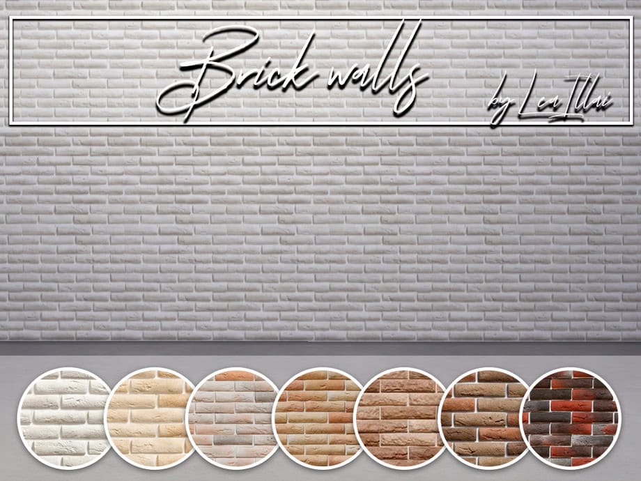 Created by Pralinesims, this collection features a variety of modern brick walls for your family home. You’ll find ten variations, ranging from clean white blocks and soft greys to deeper reds, burnt oranges, and dark charcoal tones.