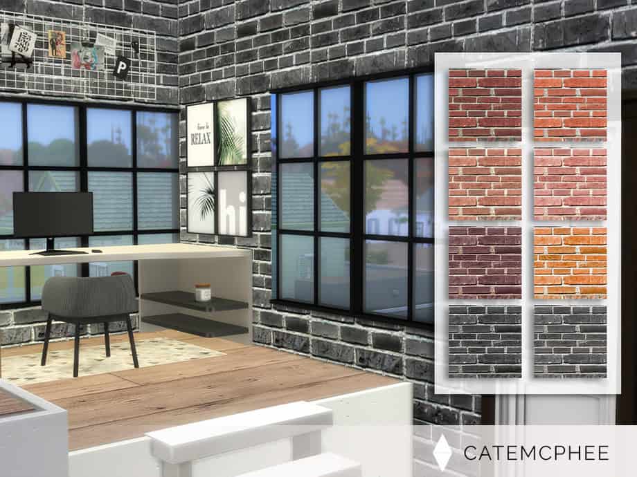 Designed with a bold, graphic quality and contrast-heavy texture, this Sims 4 brick wall cc instantly stands out in your Sim’s modern loft or creative studio. You’ll find eight swatches, so you can choose a suitable shade for your build.