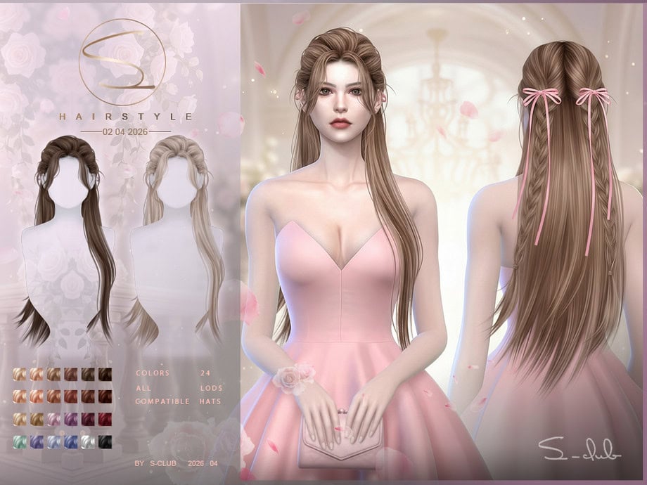 Sclub TS4 Hair is a long, flowing alpha hairstyle with soft braid detailing and delicate ribbon accents that instantly elevate your Sim’s look. I love how the strands are smooth and polished, falling neatly down the back. This makes the hair a strong pick for formal outfits or soft, feminine styling.