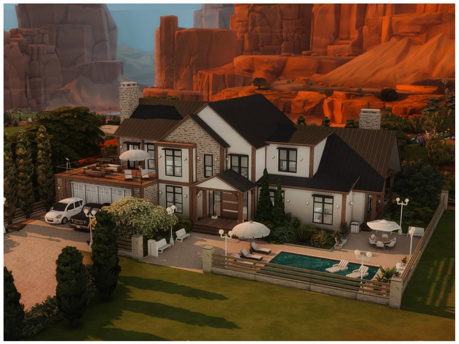 If you want a clean, modern family home without dealing with CC, MM Trans Modern 28 is a solid pick. The build comes with a fully furnished residential lot with 2 floors, 4 bedrooms, and 3 bathrooms. The exterior keeps a simple modern look, and the backyard setup adds extra value with a pool and outdoor lounging space.