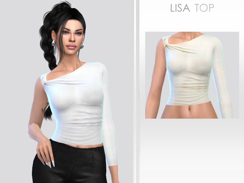 The Lisa Top is a sleek and modern top with a simple, minimal vibe. Designed with an asymmetrical cut with one long sleeve and one bare shoulder, this top brings a chic edge to your Sim’s look.