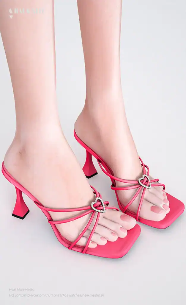 Created by Charonlee SIMS, the Heat Mule Heels are a chic footwear choice designed with playful details. These open-toe heels come with thin straps accented by a heart-shaped charm, making them perfect for both casual and dressy Sim looks.