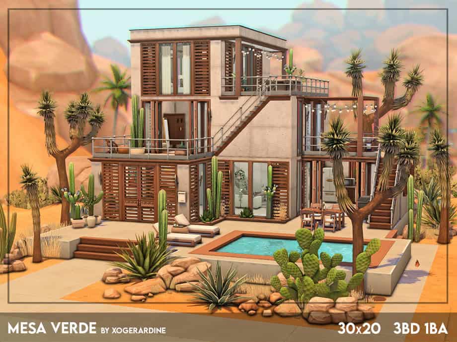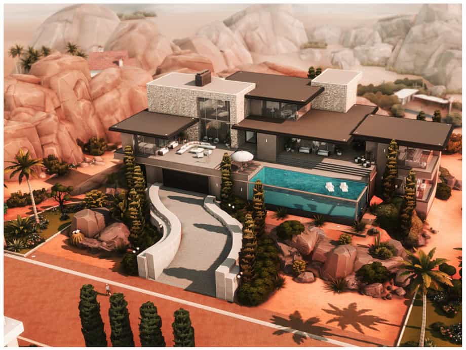 The architecture features layered levels, wooden shutter detailing, and expansive windows that flood the interiors with natural light. There’s also a pool and lounge area for outdoor entertainment. Note that the home costs 76,663 Simoleons, sits on a 30×20 lot, and requires no additional CCs to use.