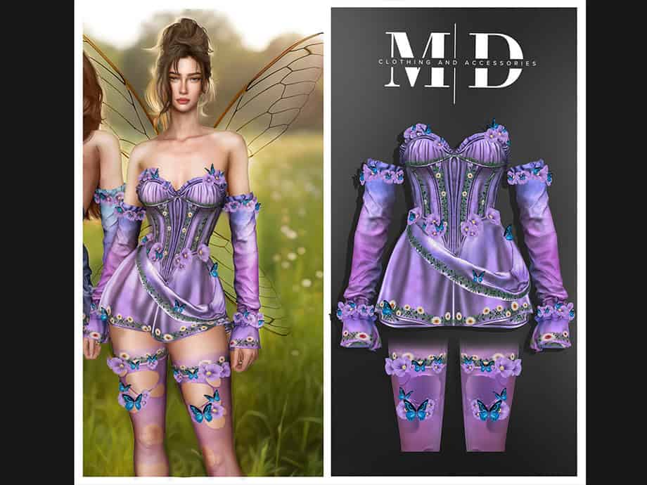 Step into a world of magic and fantasy with the Aurora Fairy Dress V1, a breathtaking outfit designed for Sims who thrive in whimsical storytelling. This intricately detailed dress comes with butterfly accents, floral embellishments, and a shimmering corset silhouette. I used it to create an enchanted forest look in the Enchanted EP.