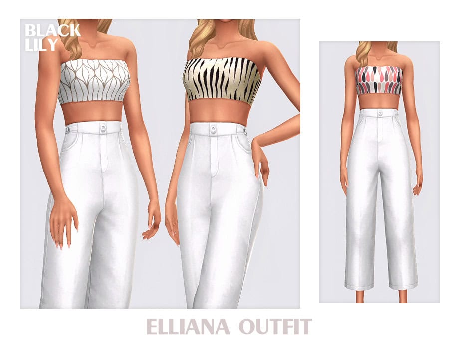 The Elliana Outfit is a stylish piece, perfect for Sims who want a polished and modern look. This two-piece set combines a patterned strapless crop top with crisp, high-waisted trousers for a clean silhouette that works across casual and semi-formal occasions.