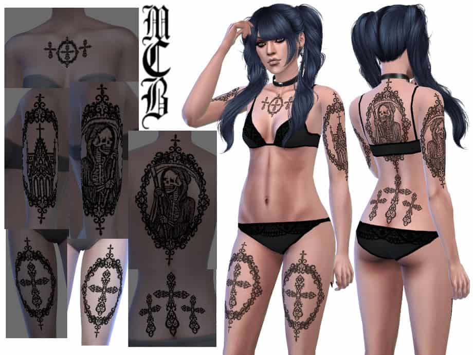 For Sims who embrace dark aesthetics, the Gothic Cross In Frame Thigh Tattoo is the perfect detail to complete their look. This striking design has ornate cross motifs framed in intricate Gothic patterns. These features make it stand out across your Sim’s thighs.