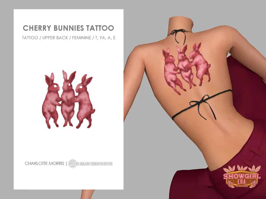 I know this design may not be everyone’s cup of tea, but the Cherry Bunnies Tattoo is an unforgettable detail for Sims who love playful, unconventional body art. Placed on the upper back, the design shows three vivid cherry-red rabbits.