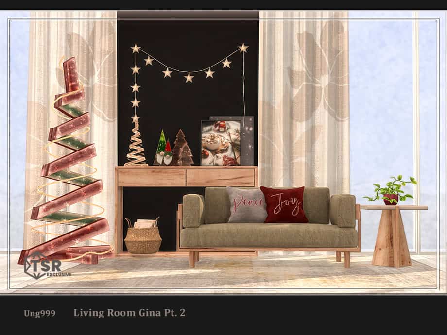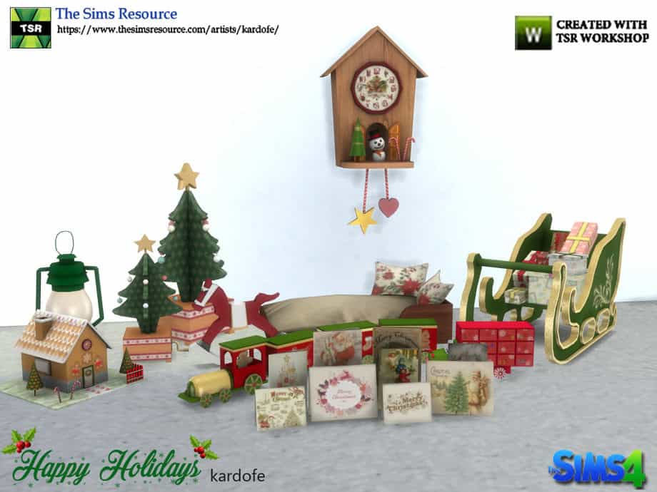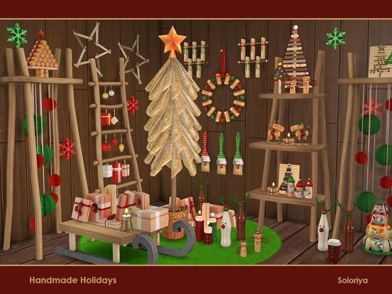 If you’re looking for playful Christmas decorations with a handmade, wooden-toy aesthetic, check out the Festive Lounge 2 set. This custom content pack contains colorful garlands, hanging loops, bright bows, a luminous angel, wooden reindeer, and a Santa mailbox. You also get multiple stylized trees, a snowman figure, and a toy train with tracks.