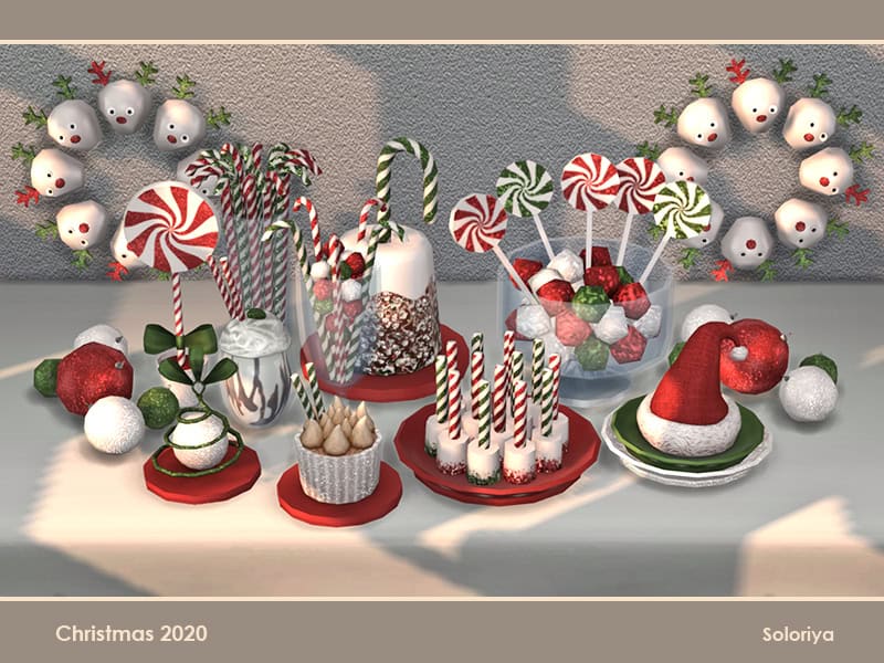 If you’re looking for playful, candy-themed Christmas décor to brighten up your Sims’ holiday tables, this Christmas 2020 set delivers a full spread of treats in two festive color palettes. The collection includes plates topped with Santa hats, peppermint décor, a candy tree, cupcakes, cocktails, assorted candies, a dessert plate, a wreath with deer, and decorative balls.