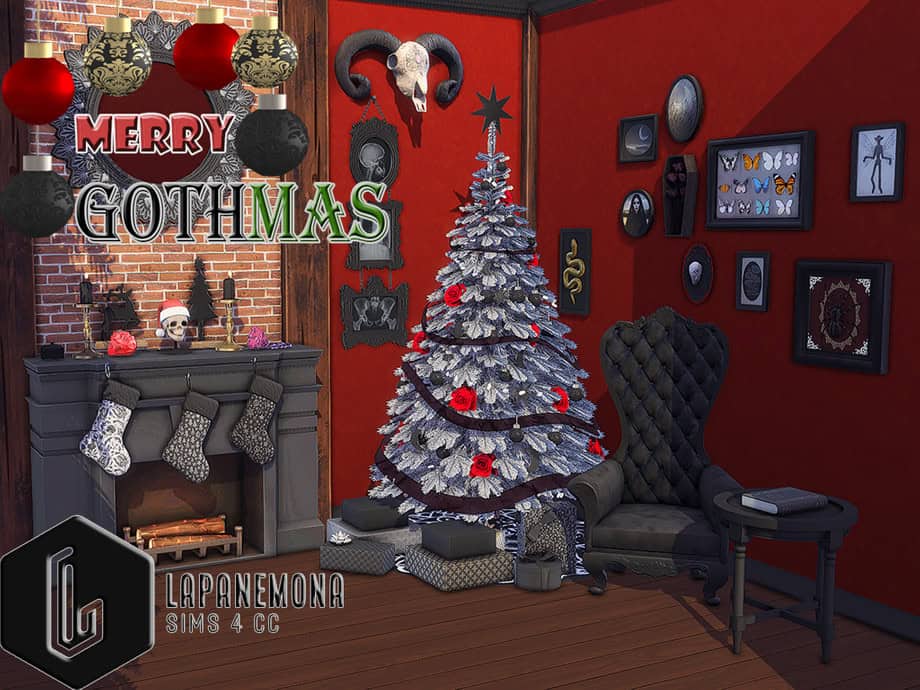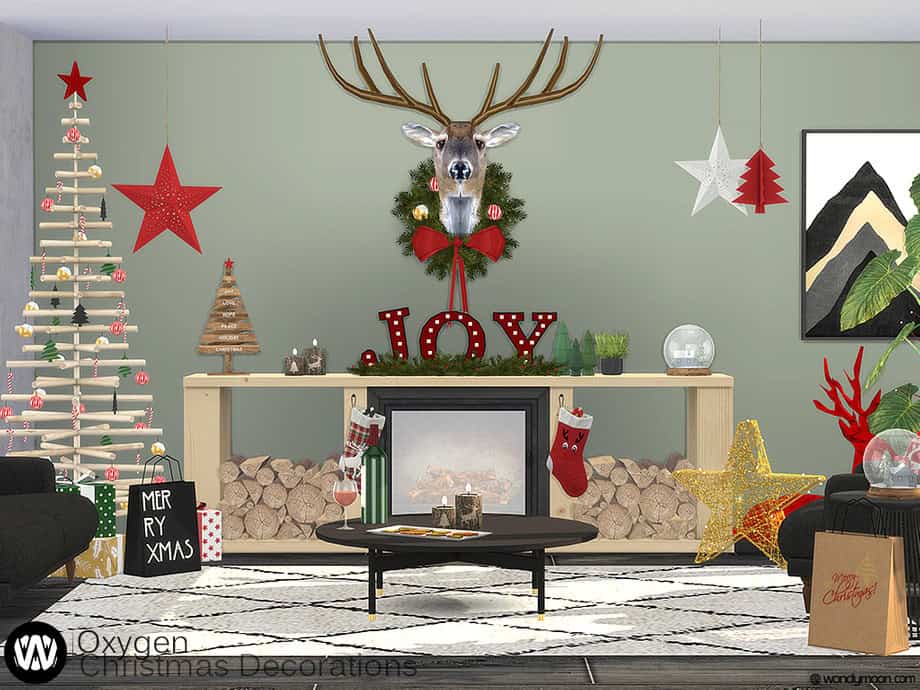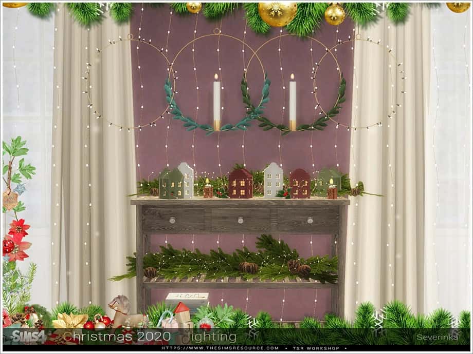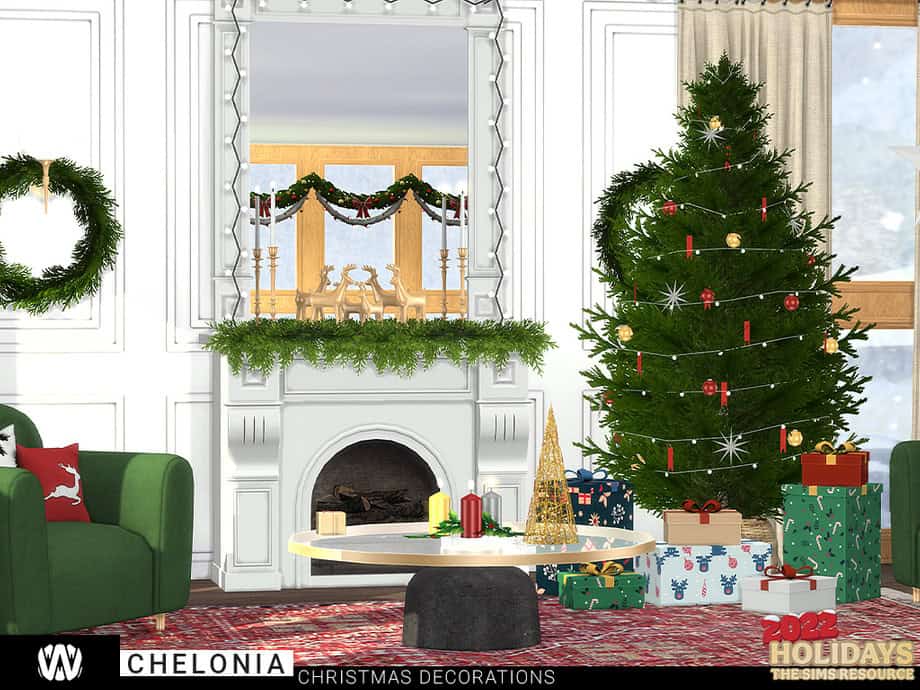 This Sims 4 Christmas decor set is best used to create cohesive scenes around fireplaces, living rooms, or formal dining spaces.
