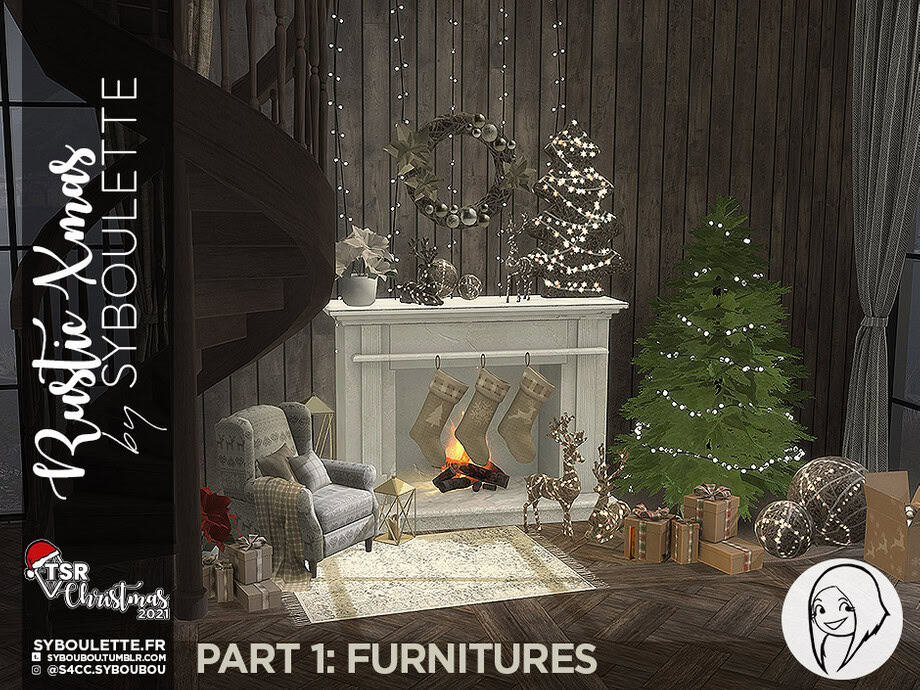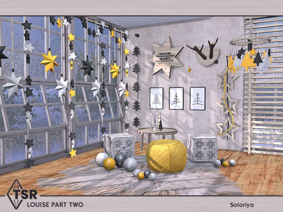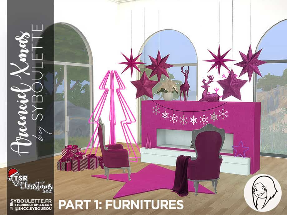 Created by Syboubou, the Arcenciel Xmas Part 1 is a special Christmas set for Simmers who love colors, modern, and a different style of decoration. You’ll find an armchair, a matching blanket, a sculptural fireplace, stacked gift boxes, hanging paper stars in two sizes, a snowflake garland, and a star-shaped rug.