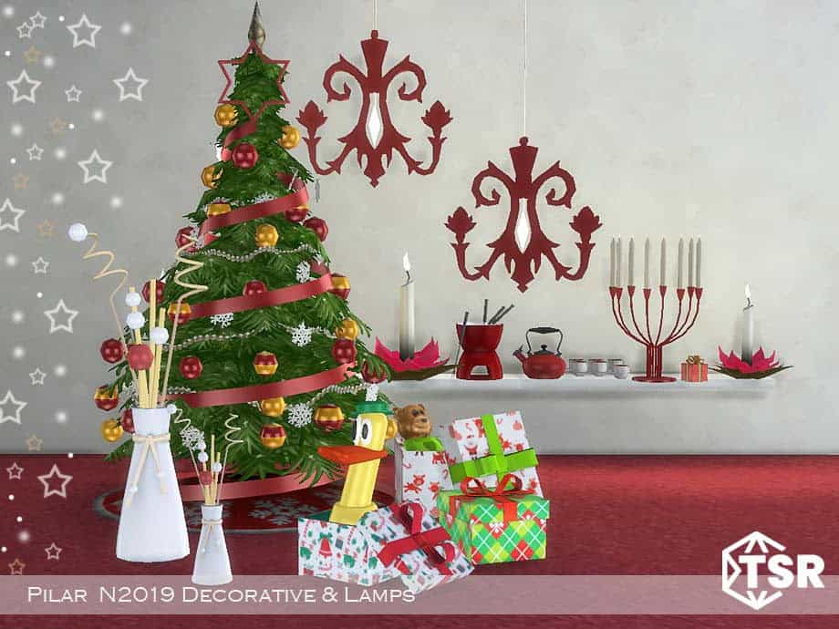 This festive clutter pack brings structure and variety to your holiday builds. It features a full collection of Christmas décor and lighting pieces, including a Christmas vase, a poinsettia plant, a fondue pot, and gift boxes. There are also trays and multiple stylish ceiling lamps that add warm illumination to your space.