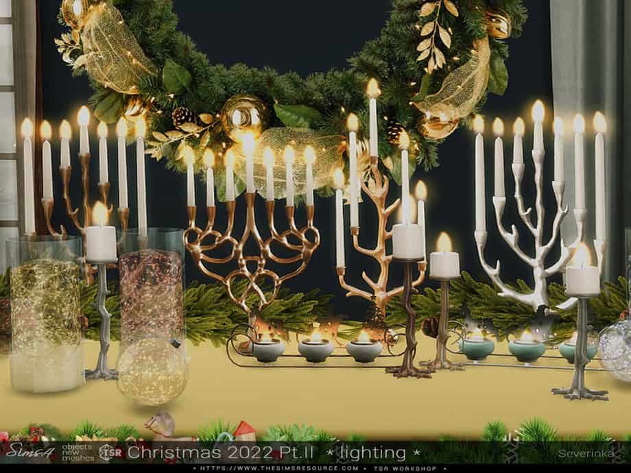To complete your Sim’s Christmas decorations, you need the perfect lighting, and this set delivers a rich mix of candles and garlands that suit both classic and modern builds. You’ll find eight pieces in the set, including two menorah-style candle holders, a five-light candle, a sleigh-shaped candle, two forest-tree candles, and two glass lamps filled with glowing garland.