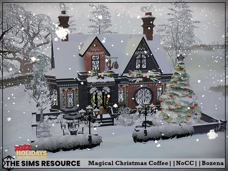 Magical Christmas Coffee is a festive storybook hideaway tucked inside Windenburg. Designed as a community lot, the build boasts Tudor-inspired architecture paired with rich holiday décor.