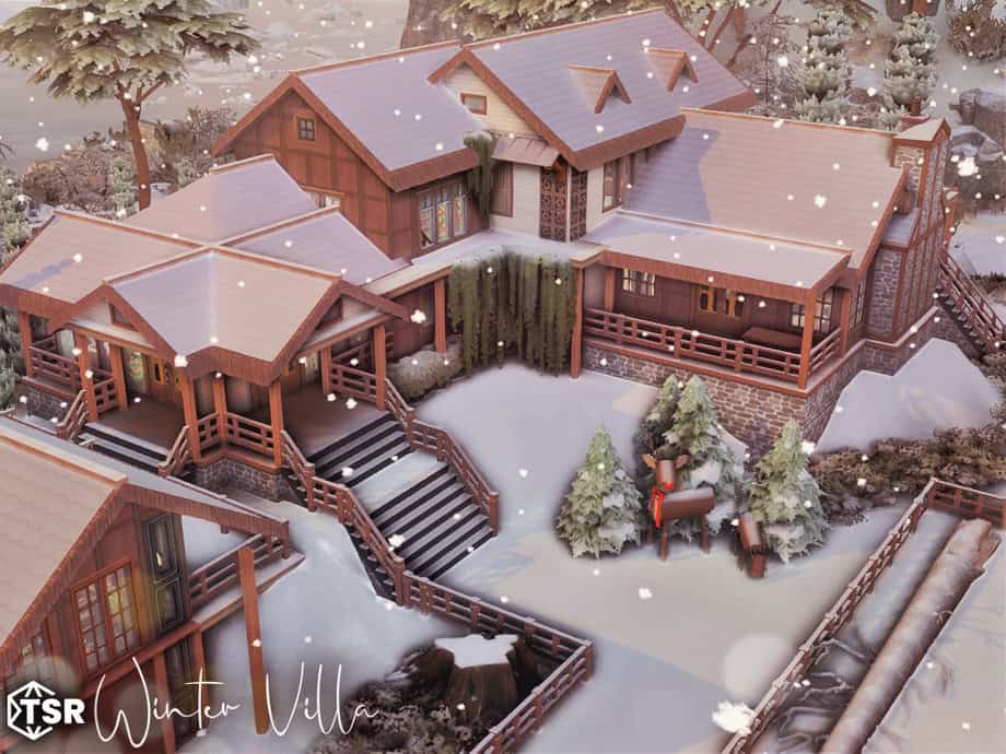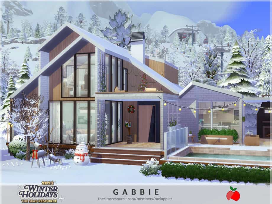 I recommend using this Sims 4 Christmas house for multigenerational gameplay or hosting big Winterfest gatherings. The interiors come fully furnished, and the exterior features a beautifully crafted backyard complete with a hot spring. Your Sims can relax here after a long day of holiday celebrations or snow-filled adventures.