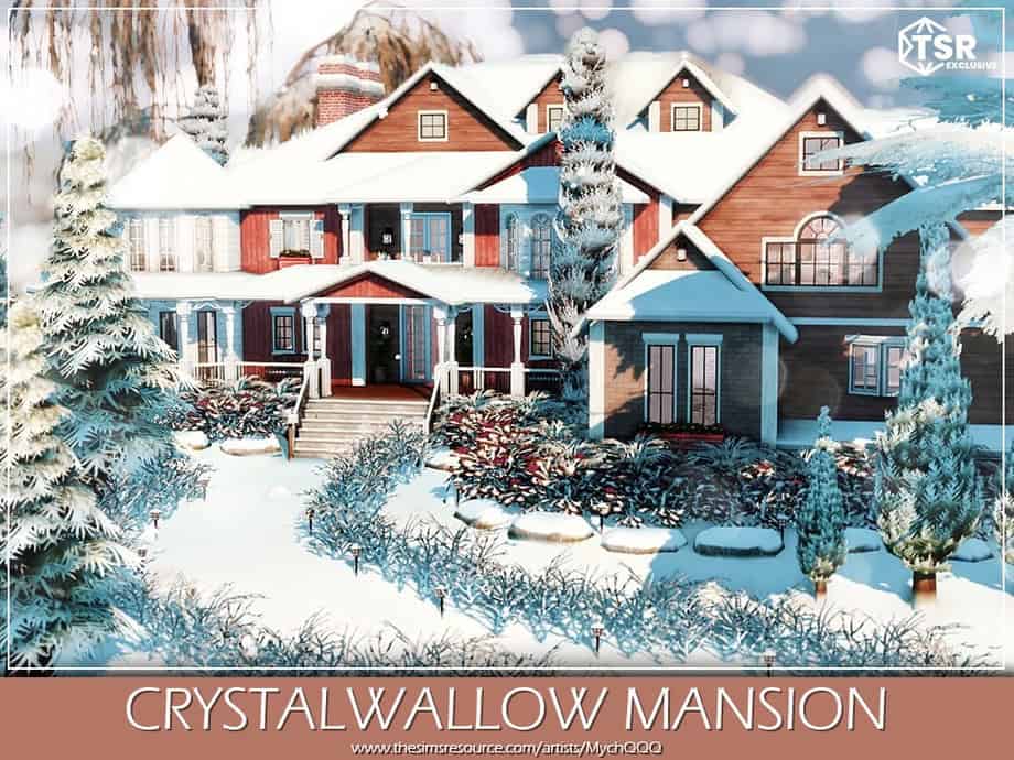 For those who want a grand winter estate, get this Crystalwallow Mansion. It’s an unforgettable holiday home, spanning a massive 64×64 lot. This three-story mansion features rich wooden textures, steep gables, and elegant seasonal décor.