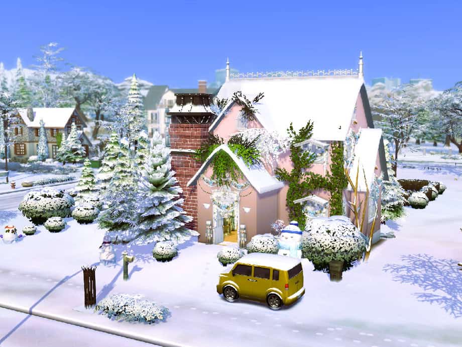This charming Pink House is one of my favorite Sims 4 Christmas Houses on this list due to its pink exterior. Designed for a small family with one child, this build offers a cozy living area and a combined kitchen–dining space.