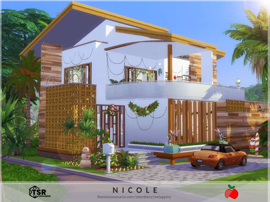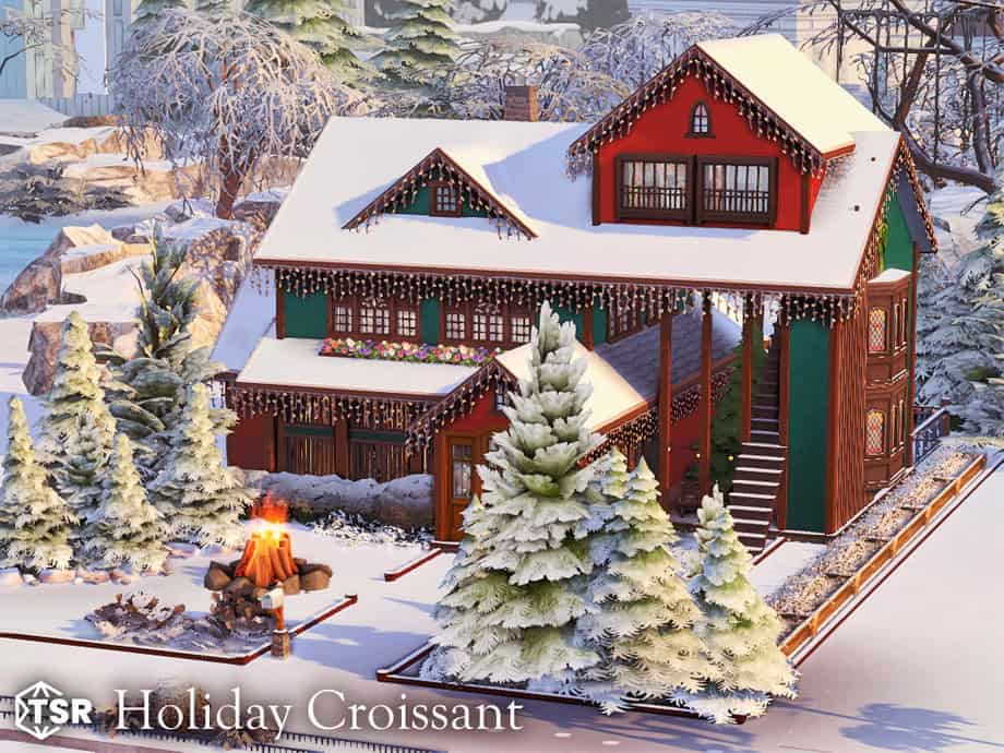 The Holiday Croissant Christmas House is a stunning Sims 4 Christmas house with outdoor hot tub. The two-bedroom house has the following: