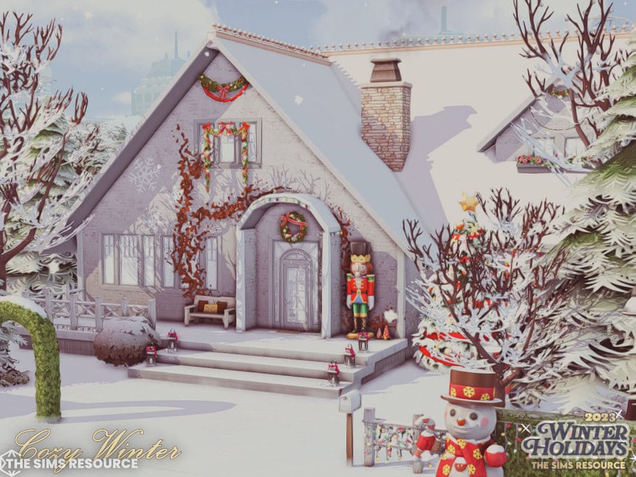 Designed for a couple and one child, this two-story build is fully furnished. The outdoor space includes room for horse riding, making it a great choice for players who enjoy snowy rural gameplay or want to build holiday stories centered around family life.