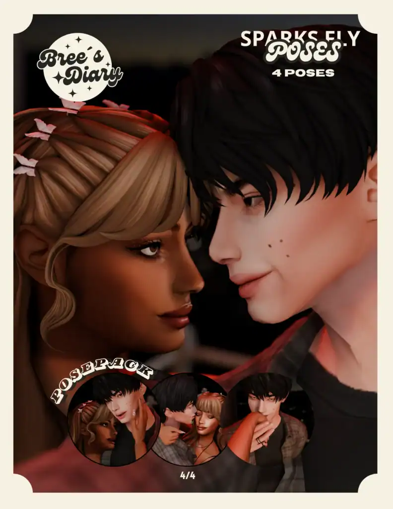 The Sparks Fly – Pose Pack includes four cinematic, intimate couple poses. These are perfect for storytelling scenes built around anticipation, attraction, and emotional connection. Designed with a romantic, slightly dramatic mood, these poses work beautifully for close-up screenshots, couple selfies, and tender moments.