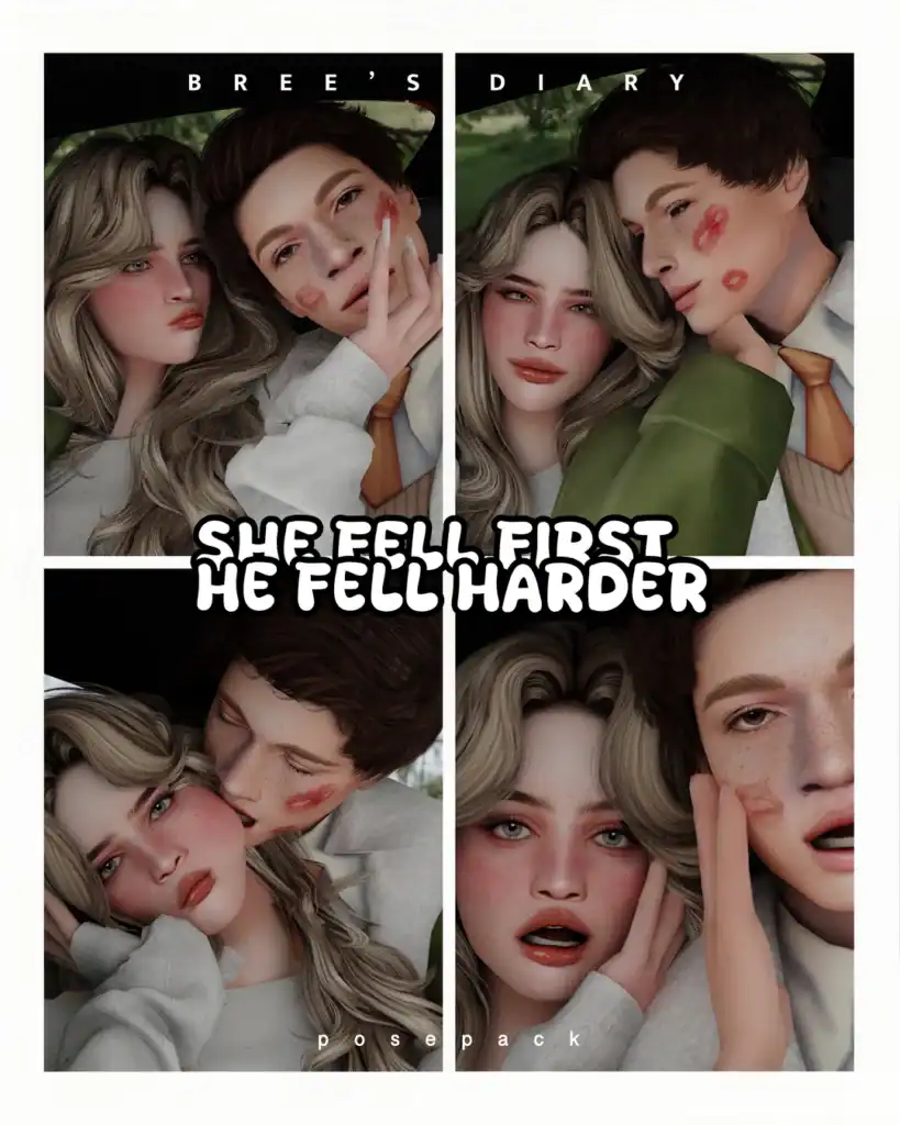 She Fell First, He Fell Harder – Pose Pack leans into soft romance and emotional storytelling, with a focus on closeness, tender expressions, and affectionate touches. Every frame feels intimate without being overdone.