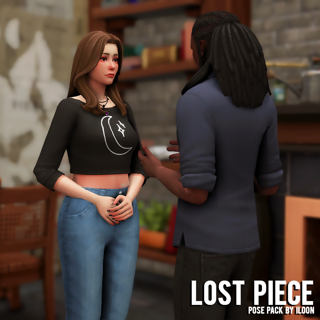The Lost Piece Pose Pack by lloooon comes with 4 couple poses designed with storytelling in mind. The poses highlight two Sims having a deep conversation, which makes it ideal for scenes that convey emotion and connection. This Sims 4 couple poses cc was created as a gift to a fellow Simmer and carries a personal and heartfelt touch from the pose creator.