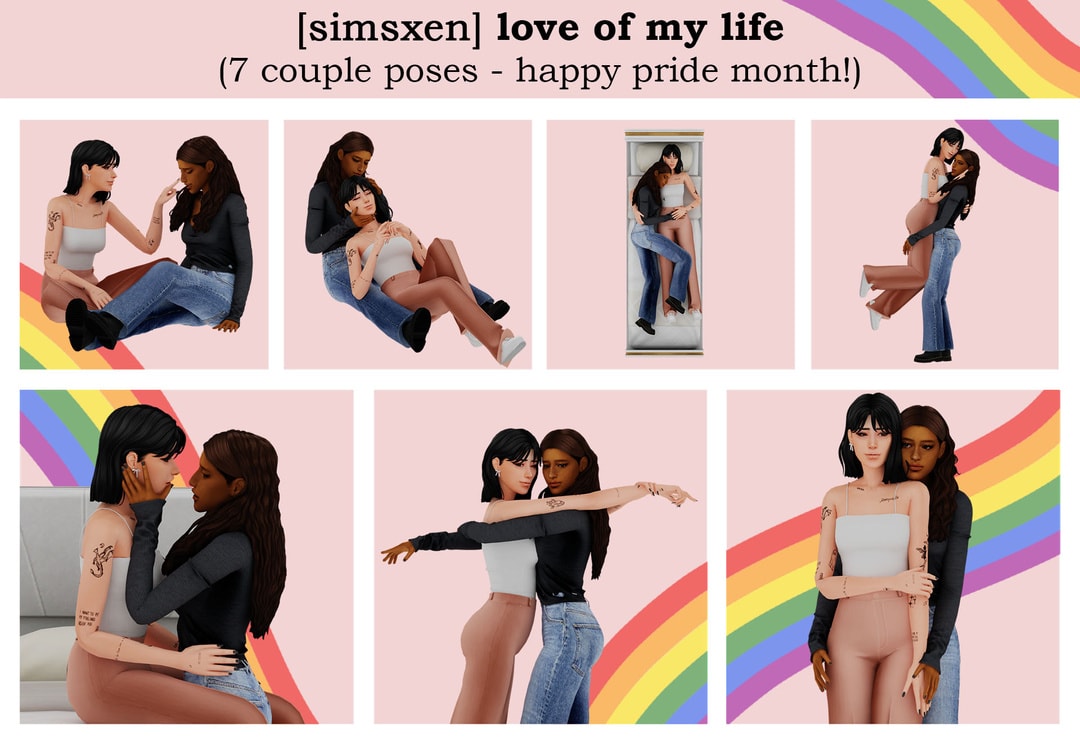 If you’re looking for an inclusive pose pack that radiates warmth and connection, Love of My Life is an excellent choice. This Sims 4 couple pose cc contains 7 couple poses created specifically for two female Sims. It’s designed in celebration of Pride Month and brings a vibrant, inclusive touch to your screenshots. To use it, you’ll need to download Andrew’s Pose Player and Teleport Any Sim. You can use this pack to add a colorful, celebratory feel to your romantic storytelling.