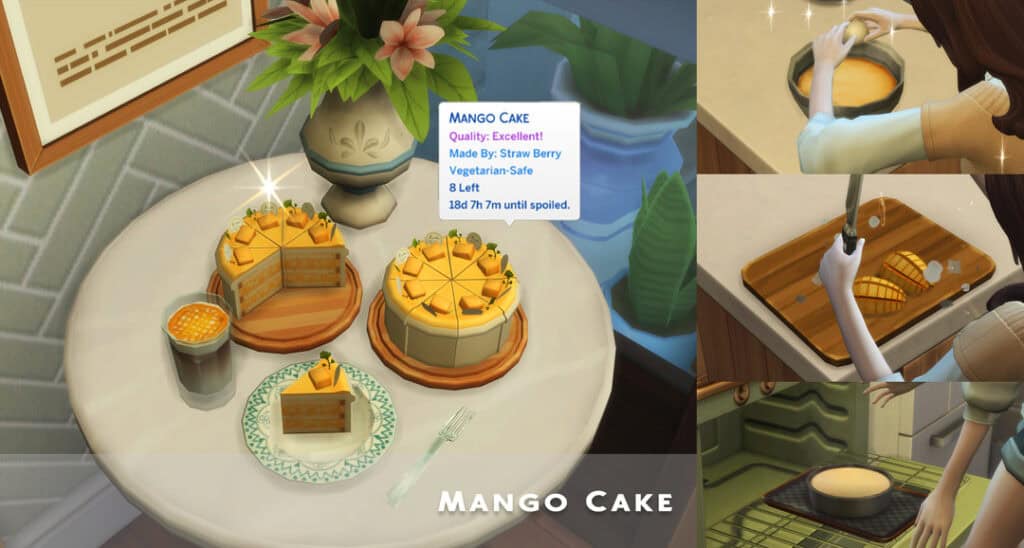 The recipe serves eight, is vegetarian-friendly, and works with the Simple Living lot challenge when using optional ingredients. You’ll need the Get to Work EP and Oni’s latest Recipe Pack Mod for the cake to appear in the baking menu. Use this baked recipe for tropical builds, summer parties, or birthday celebrations.