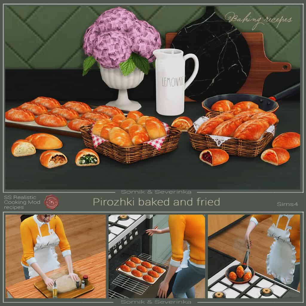 This Pirozhki set introduces twelve servings of soft, golden pastries to your game. You’ll find both baked and fried variations to suit your Sim’s dietary needs and health journey. The pastry is filled with one of six options, including jam, apples, vegetables, onions, potatoes, and meat.