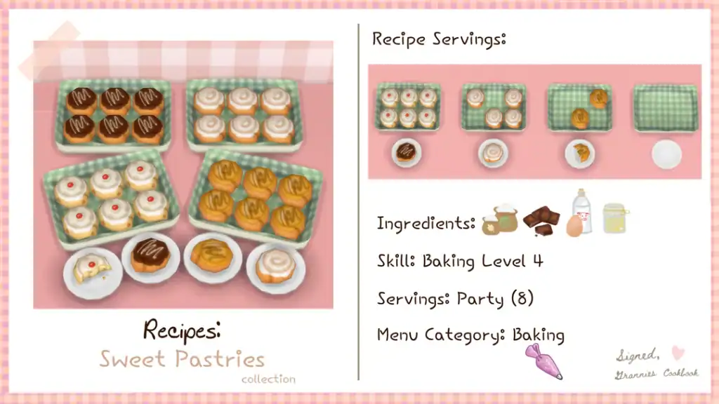 Your Sim cooks the meals using homestyle interactions at Level 2–3. Each recipe serves eight, is suitable for restaurants, and supports optional ingredients depending on whether you use the S&S Cookbook, SCCO, or the Realistic Cooking Mod. You can install either the EA-compatible version or the custom RCM/SCCO version.