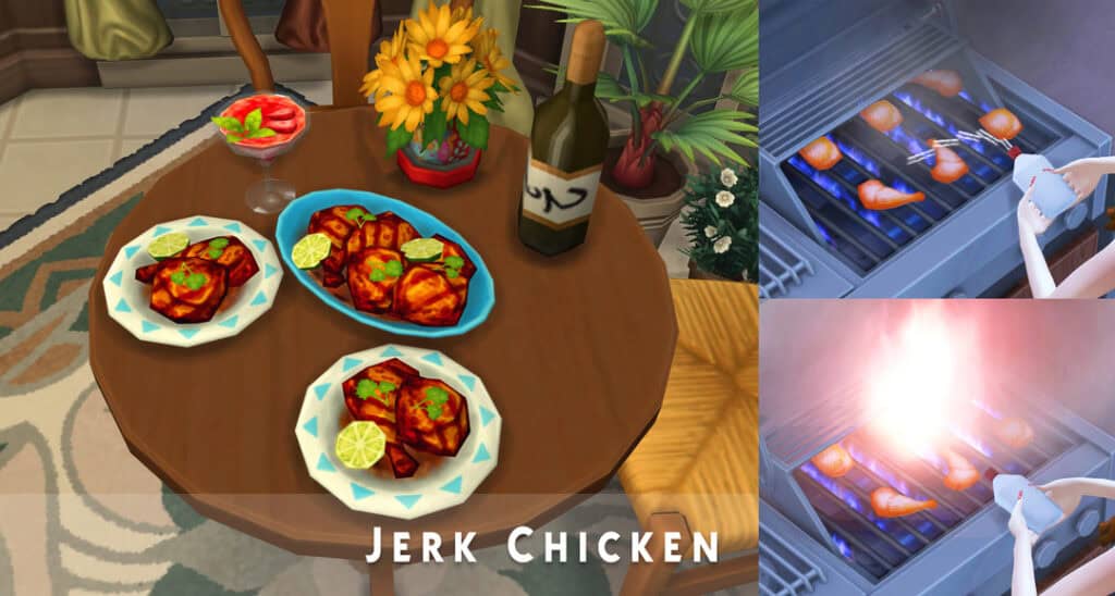 Another Caribbean classic to add to your recipe collection is Jerk Chicken. This bold, spicy dish features rich seasoning, smoky char marks, and bright lime garnishes that stand out beautifully in Maxis Match kitchens.