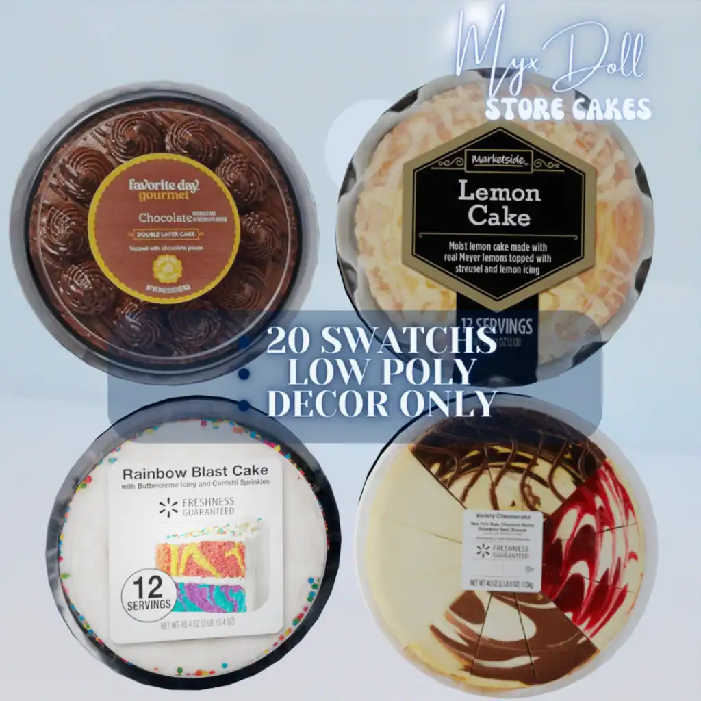 If you’re looking for realistic supermarket-style cakes to fill your grocery shelves, bakery counters, or party tables, download the Store Cake V1. This pack contains round, plastic-lid store cakes in 20 swatches. The samples include chocolate, lemon, funfetti, rainbow blast, cheesecake styles, and fruit-topped cakes.