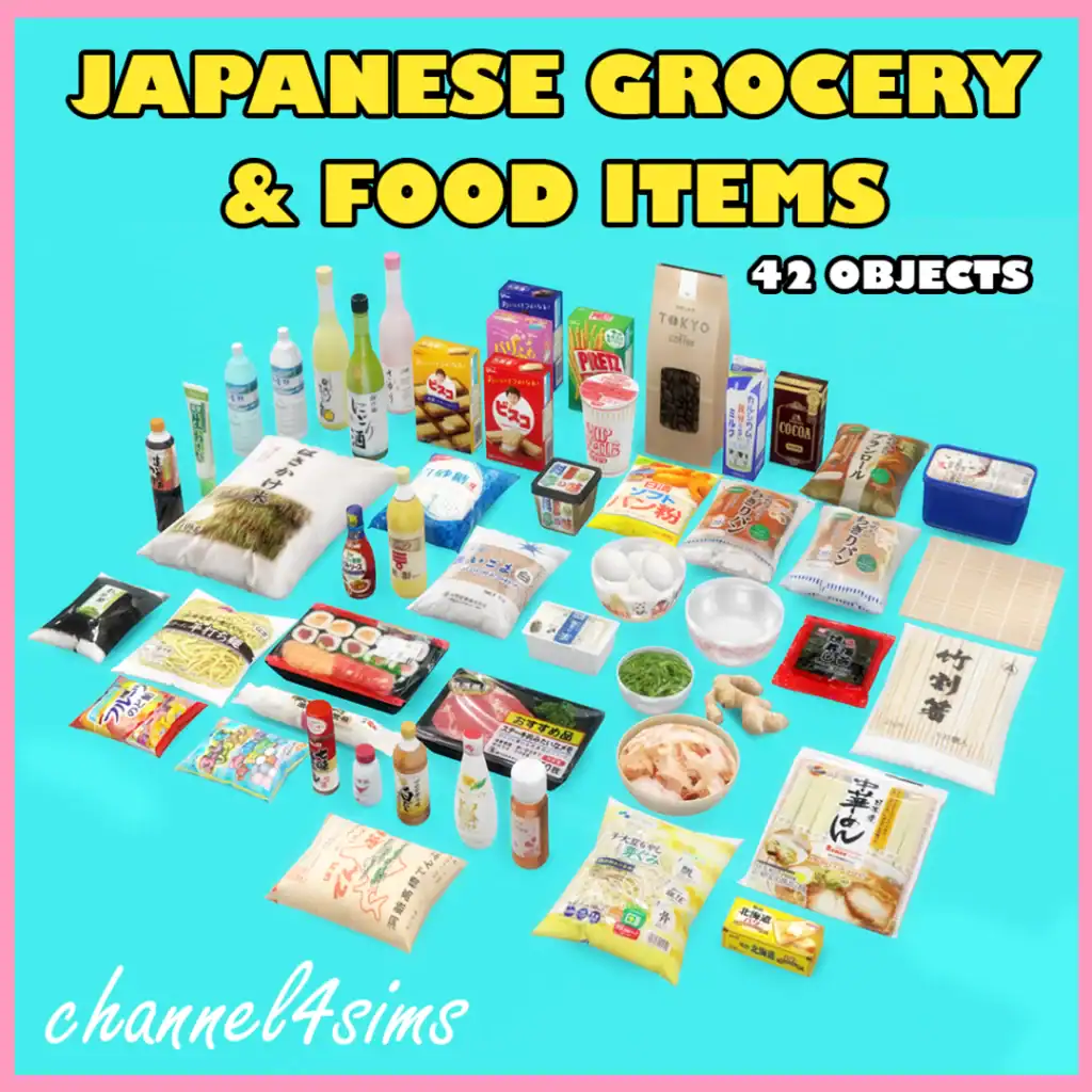 For those who want cultural representation, I found this highly detailed set of Japanese ingredients and everyday grocery staples. It contains 42 decorative food objects. Every item is inspired by real Japanese packaging and cuisine, giving your homes, shops, and screenshots an authentic cultural touch.