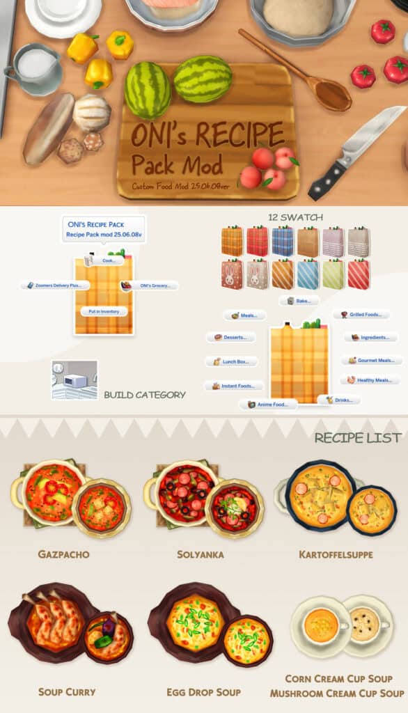 You’ll find soups, curries, rice bowls, stews, dumplings, desserts, party dishes, and even anime-inspired foods for themed gameplay. The latest version contains six new recipes for your Sims to try out.
