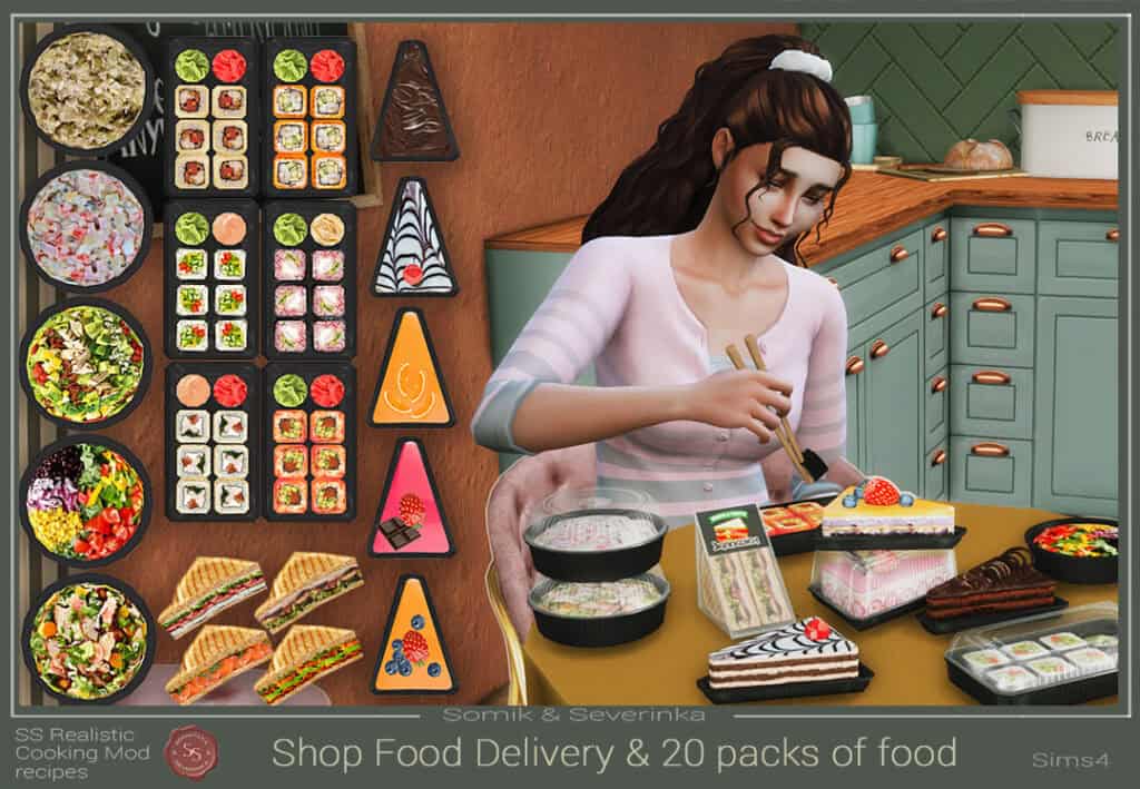 The mod adds a functional home delivery service with twenty different ready-made meals. These include bowls and salads, cakes, sushi, and sandwiches. All the dishes come with a closed lid, which automatically opens when your Sim starts eating.